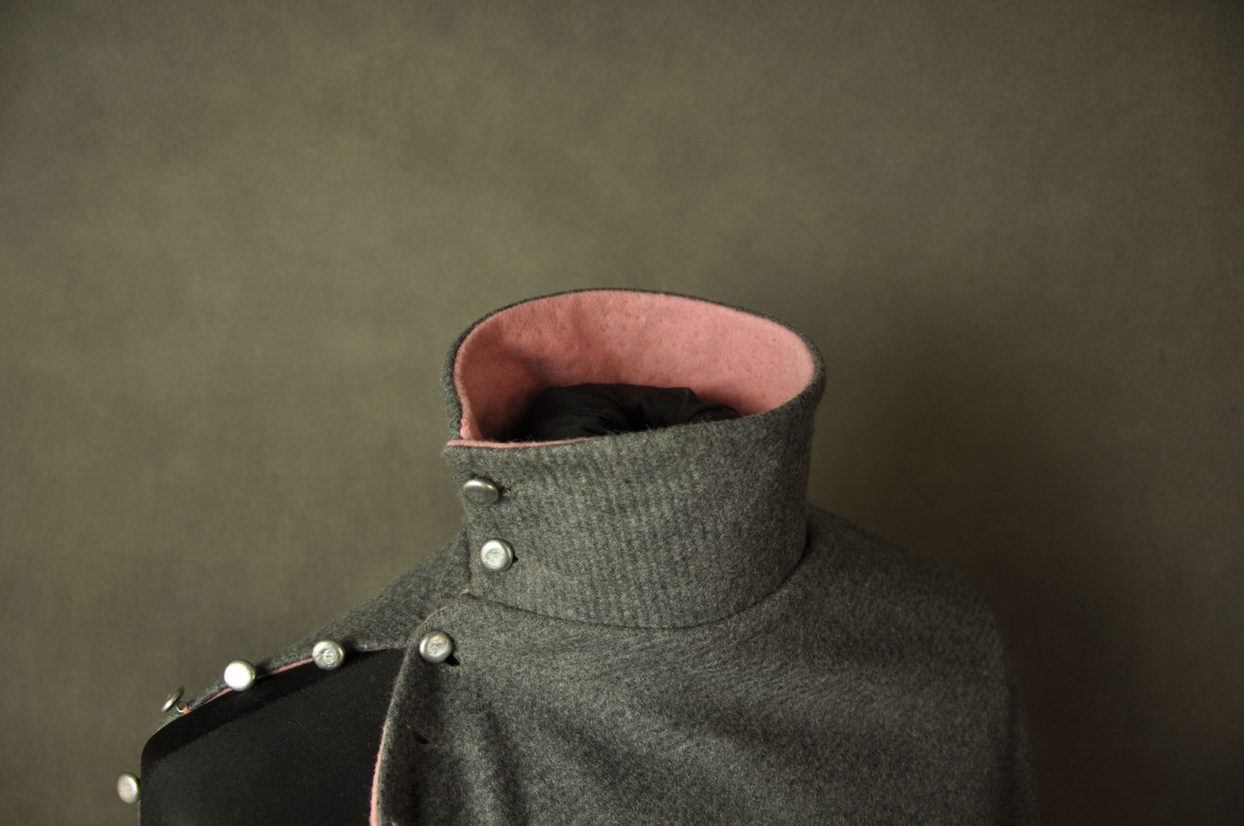Short coat from a full circle, fastened on the shoulder with six woolen buttons. Coat sewn from thick cloth with linen lining. The coat has a short collar to protect the neck from cold and wind. Optionally, it can be made with additional wool lining.