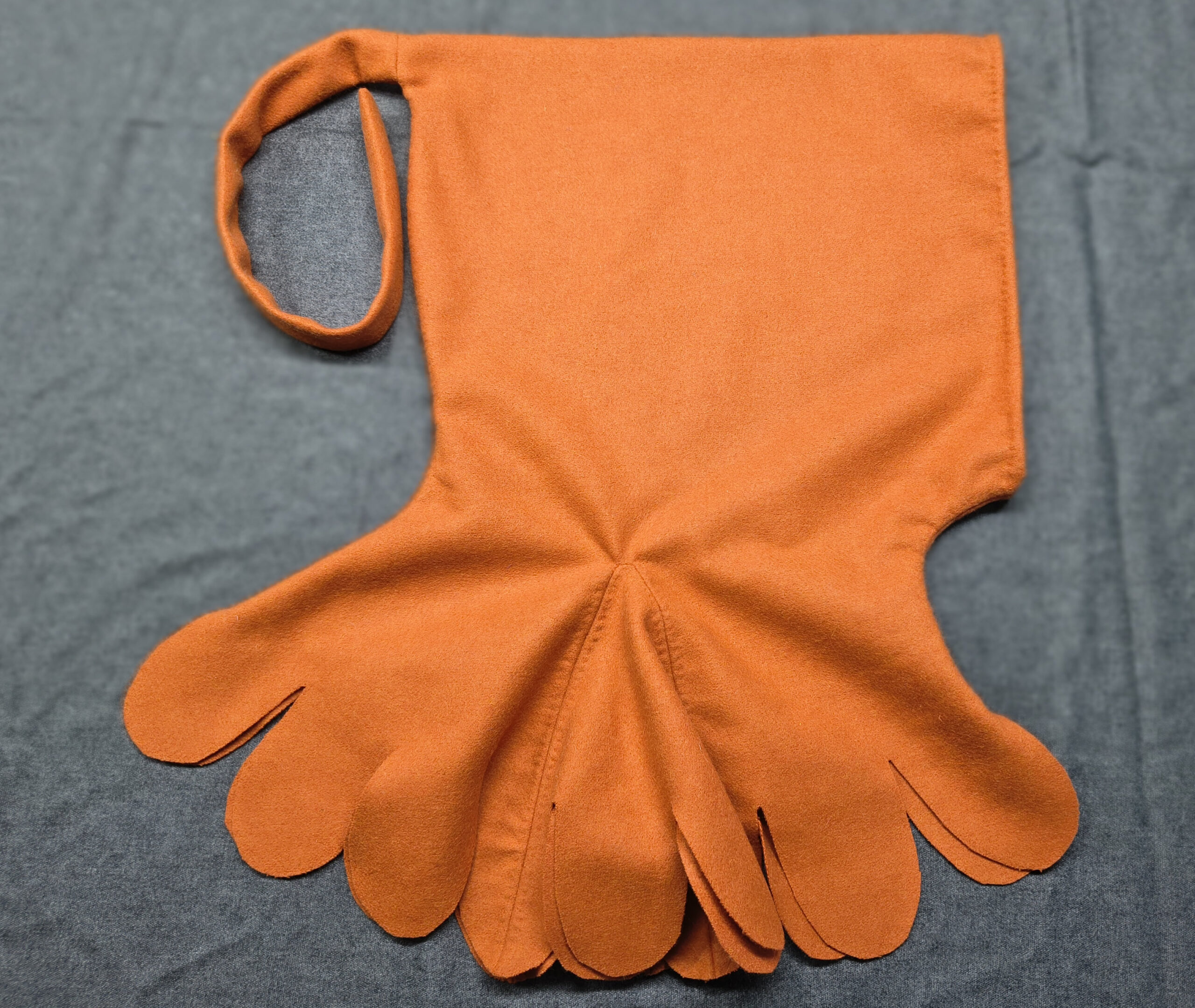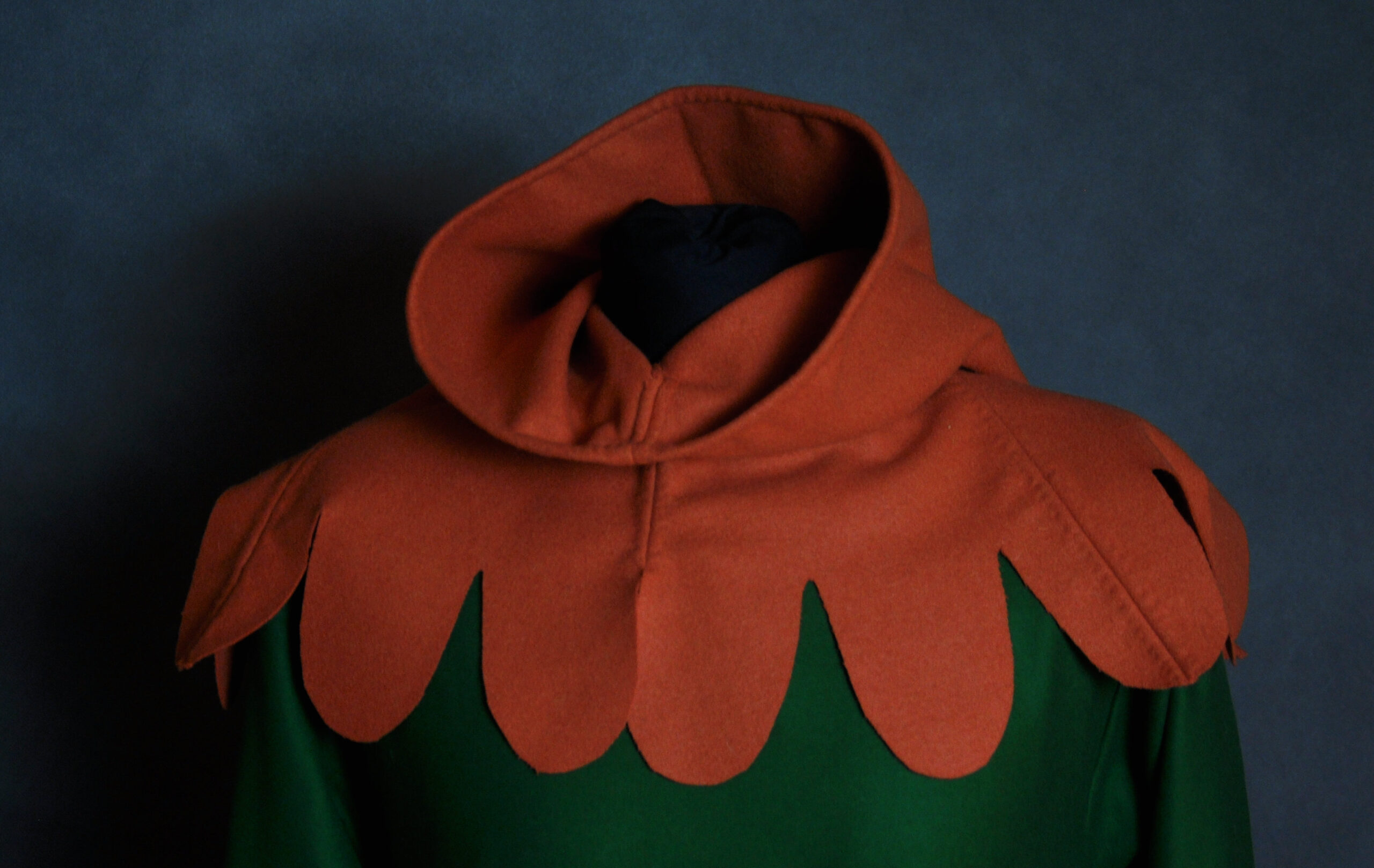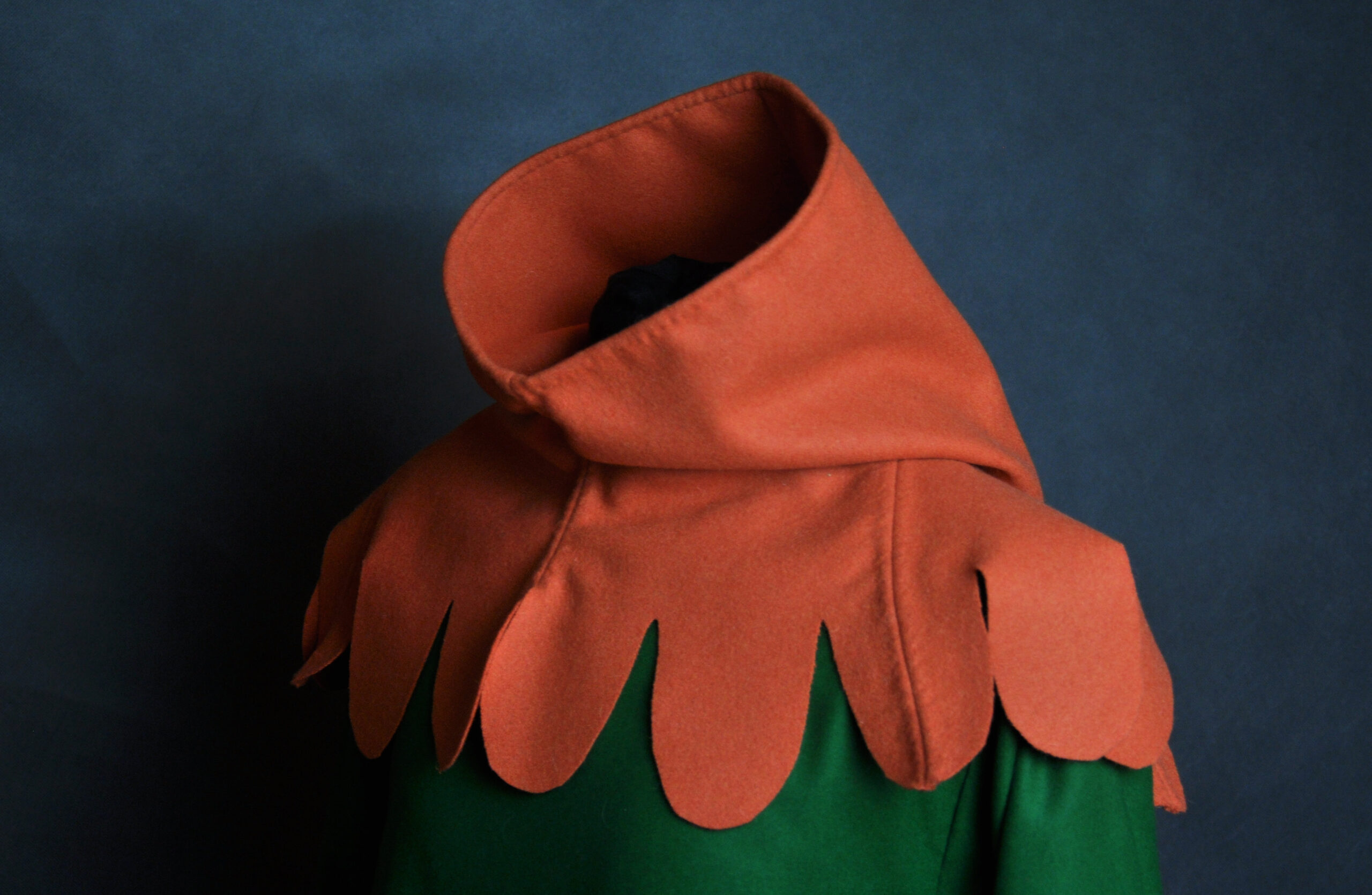 Wełniany kaptur szyty maszynowo z ręcznym wykończeniem wszystkich szwów.