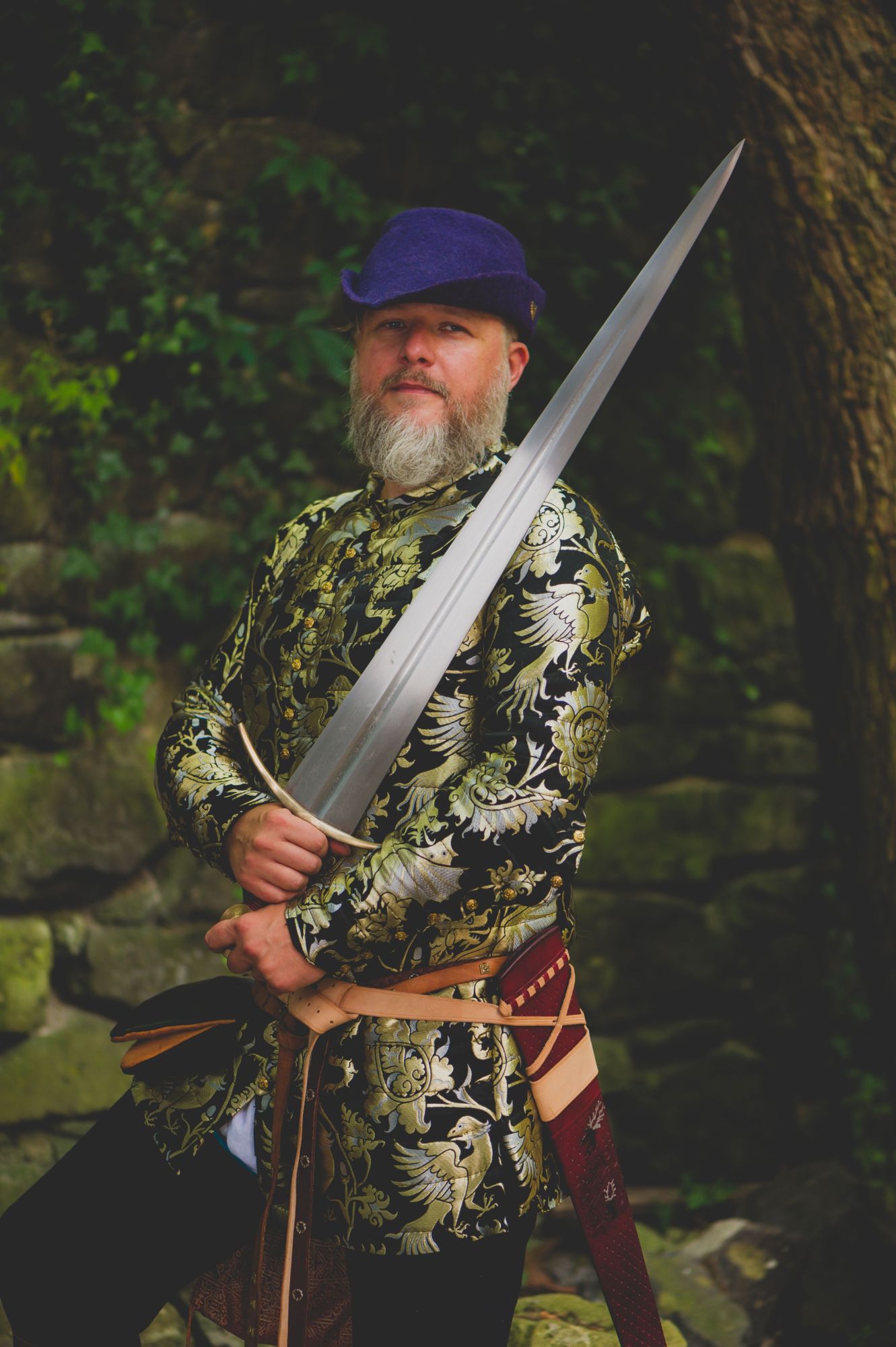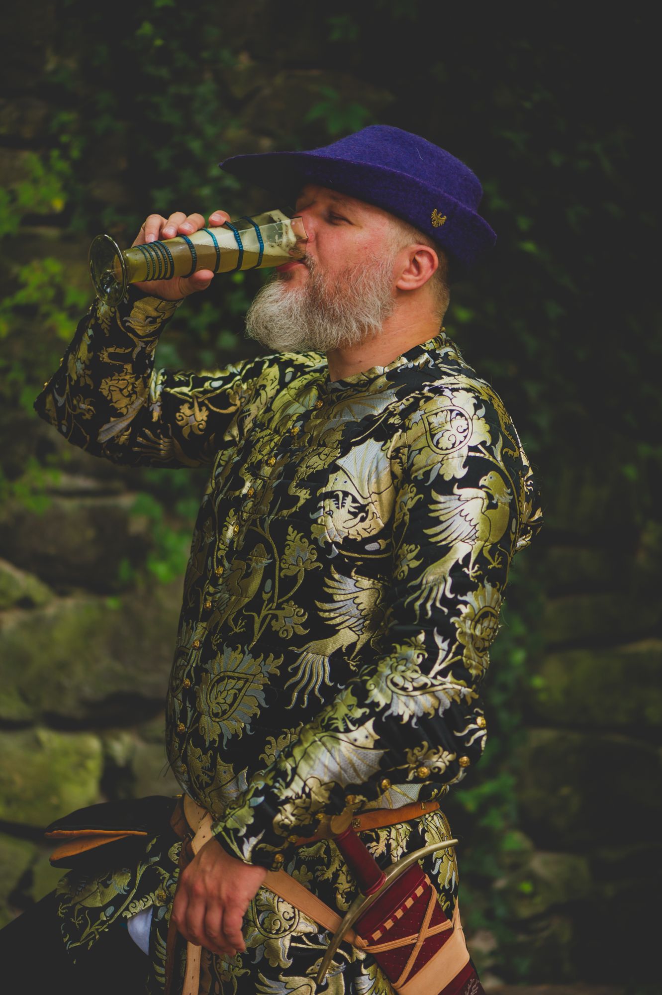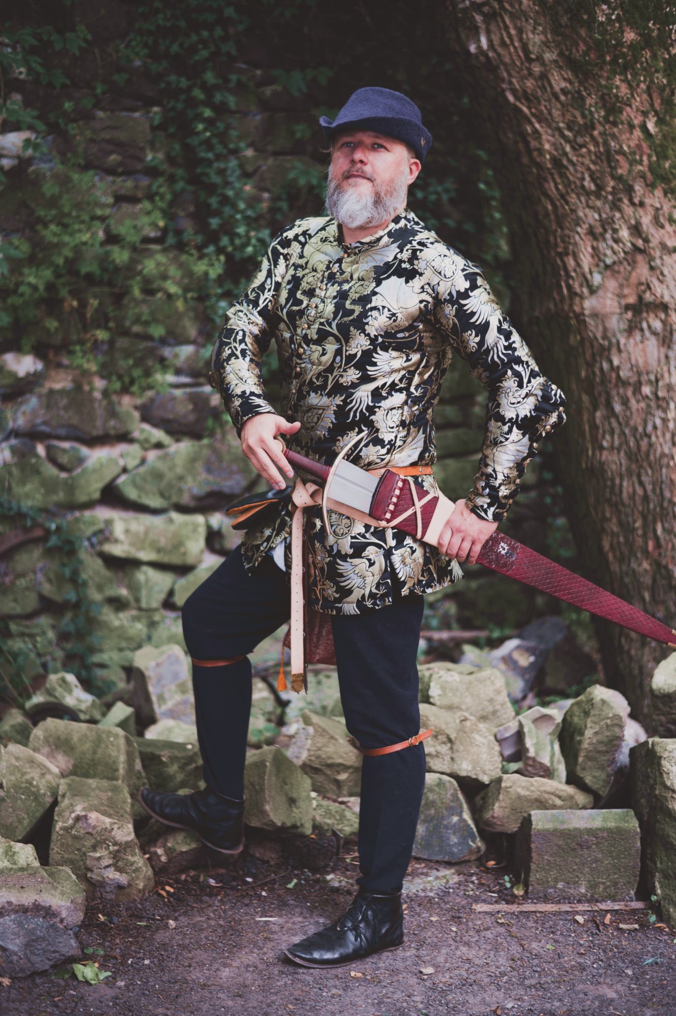 Odtworzony na podstawie jednego z najsłynniejszych zachowanych średniowiecznych ubiorów – luksusowego pourpointu należącego do Charlesa de Blois (ok.1364). Oryginał przechowywany jest w Musée des Tissus w Lyonie i stanowi unikatowe źródło wiedzy o modzie XIV wieku. Pourpoint to dopasowany ubiór, noszony zarówno jako odzież cywilna, jak i przeszywanica pod zbroję. Wersja inspirowana strojem księcia Bretanii zachowuje charakterystyczny krój z wąskimi rękawami, długą linią guzików oraz pikowaną, watowaną konstrukcją, zapewniającą wygodę oraz wymodelowanie męskiej sylwetki.