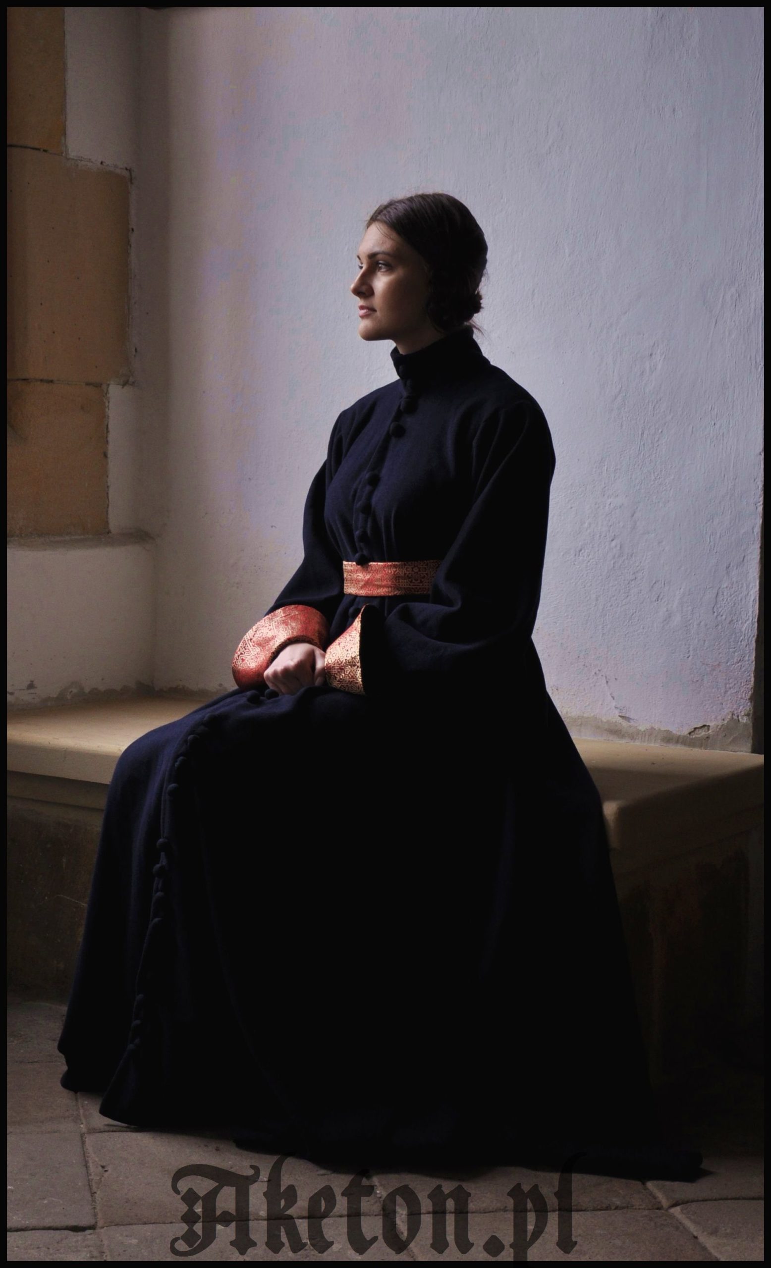 Houppelande wzorowane na rzeźbie z Lubeki z początku XV w. Suknia wełniana zapinana z przodu na guziczki w rzędach po cztery, z niskim prostym kołnierzem. Rękaw workowy zwężany na nadgarstku, następnie mocno rozszerzane ku dłoni w kształt kielicha. Rękawy na końcach ozdabiane kontrastowym jedwabiem.