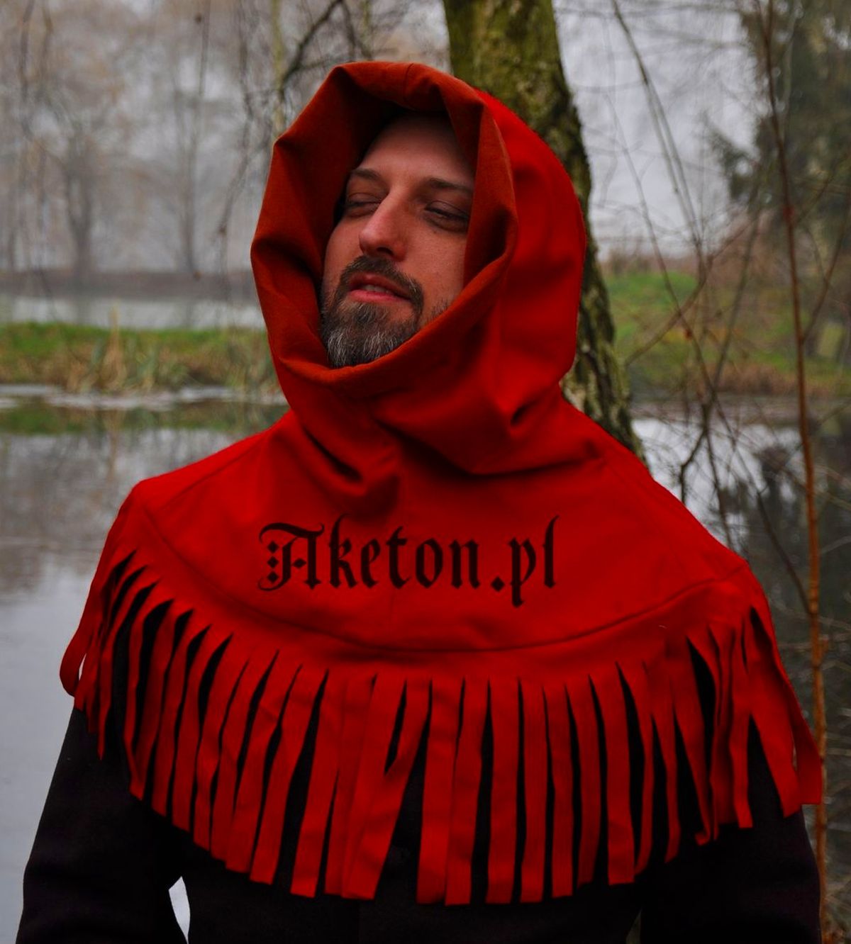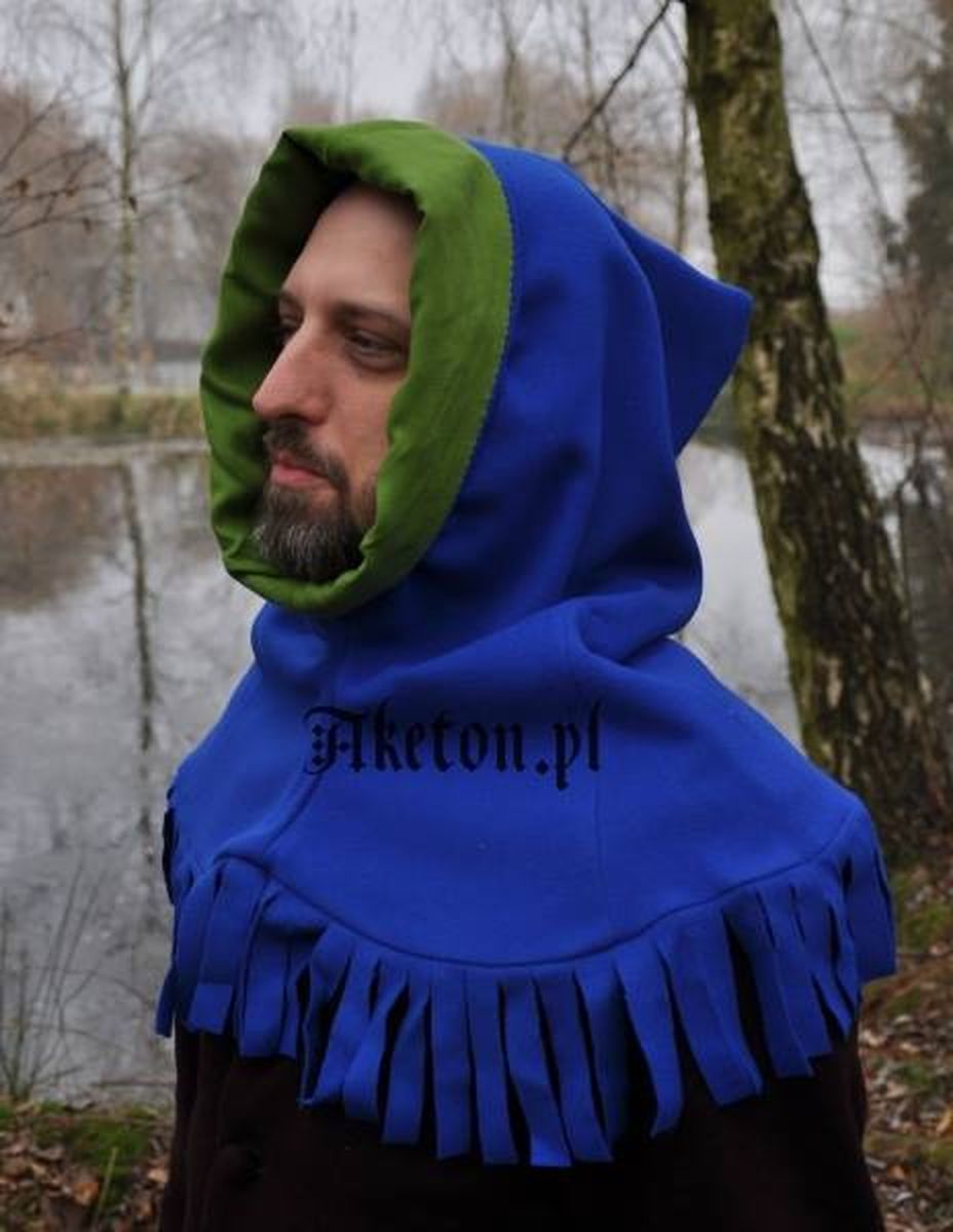 Kaptur z frędzlami szyty z wełny. Kształt kaptura wzorowany na przedstawieniach ikonograficznych z drugiej połowy XV w.