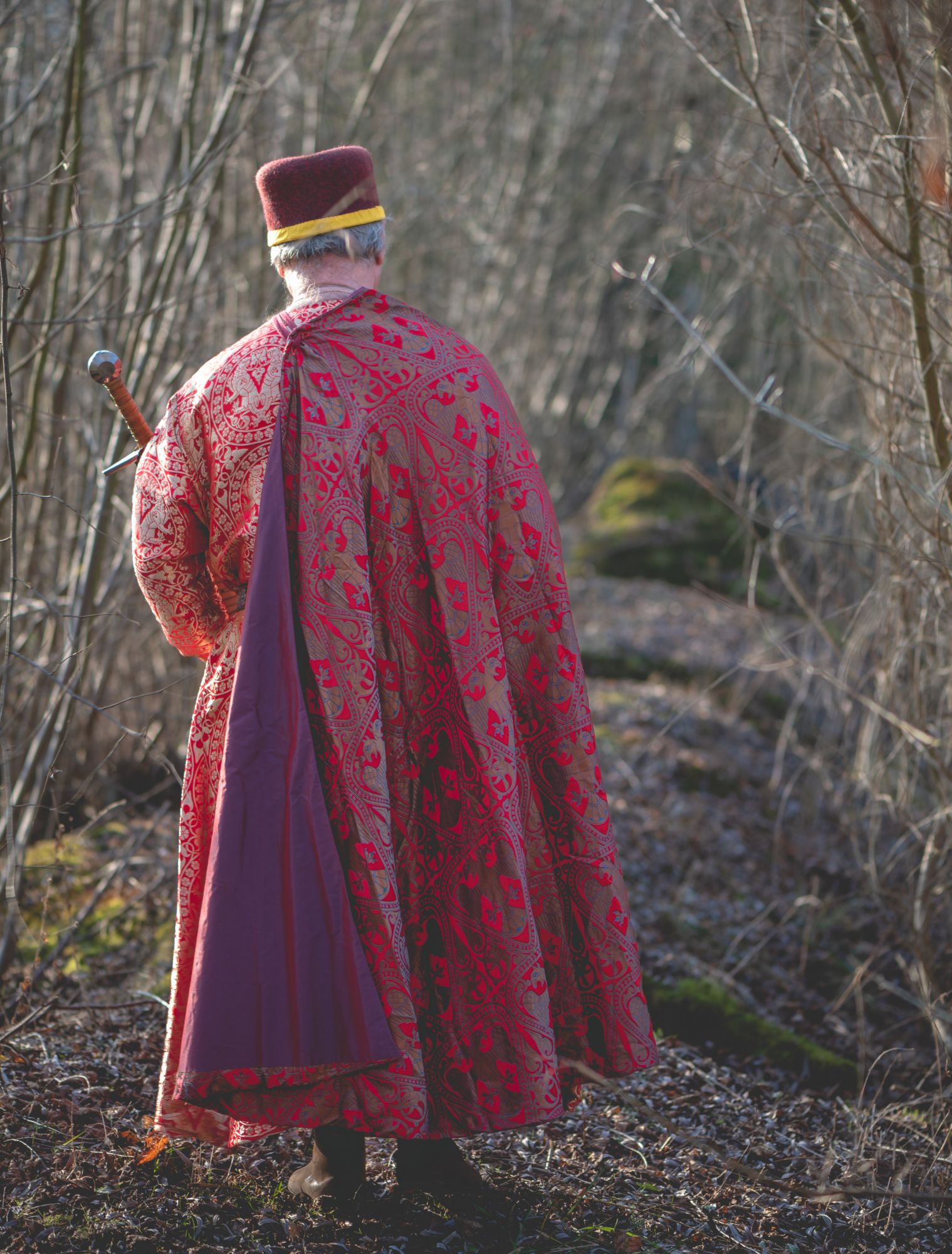 Płaszcz dowrski wzorowany na przedstawieniach ikonograficznych z XIII w. wykonany z jedwabnego brokatu na podszewce z jedwabnej tafty. Zapięcie stanowi jedwabna taśma. Płaszcz wykonany z połowy koła.