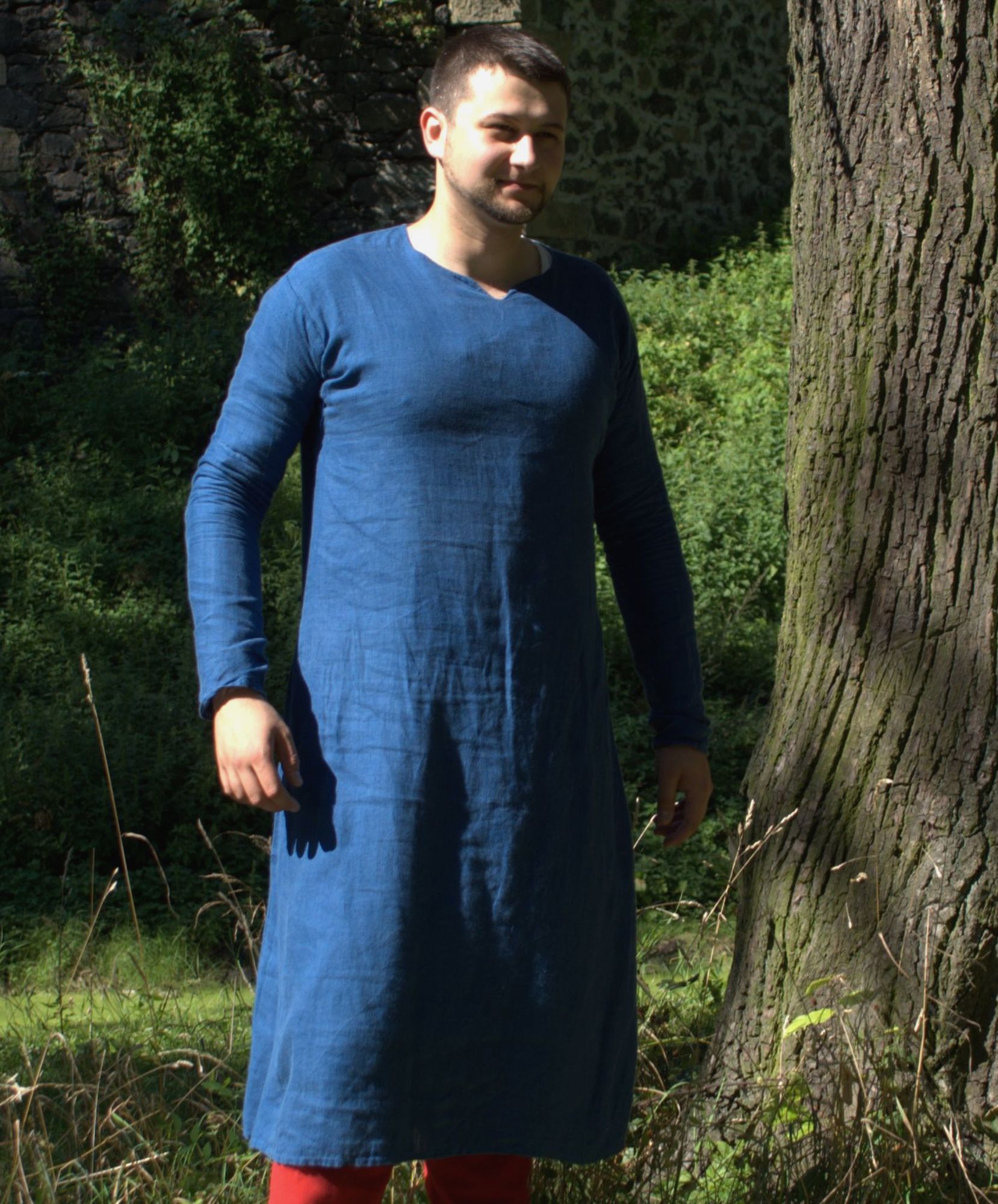 Tunika lniana z dopasowanym rękawem, sięgająca do kolana, rozszerzana klinami. Rękawy pod pachą posiadają wszyty klin, pod szyją lekkie rozcięcie ułatwiające zakładanie ubioru. Ubiór doskonale nadający się do noszenia w ciepłe dni lub jako odzienie spodnie.